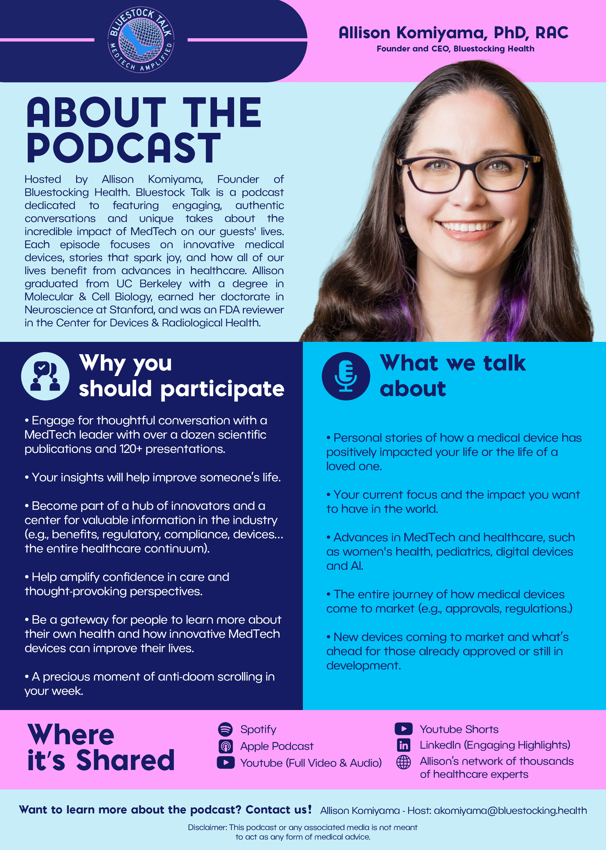 Are you a Medtech innovator, clinician, regulator, patient, or all-around MedTech nerd with a story to tell? We’re excited to be launching Bluestock Talk, a smart, spirited, slightly irreverent podcast from our very own Allison Komiyama, PhD, RAC, where regulatory insights meet real talk. We’d love for you to be our guest.